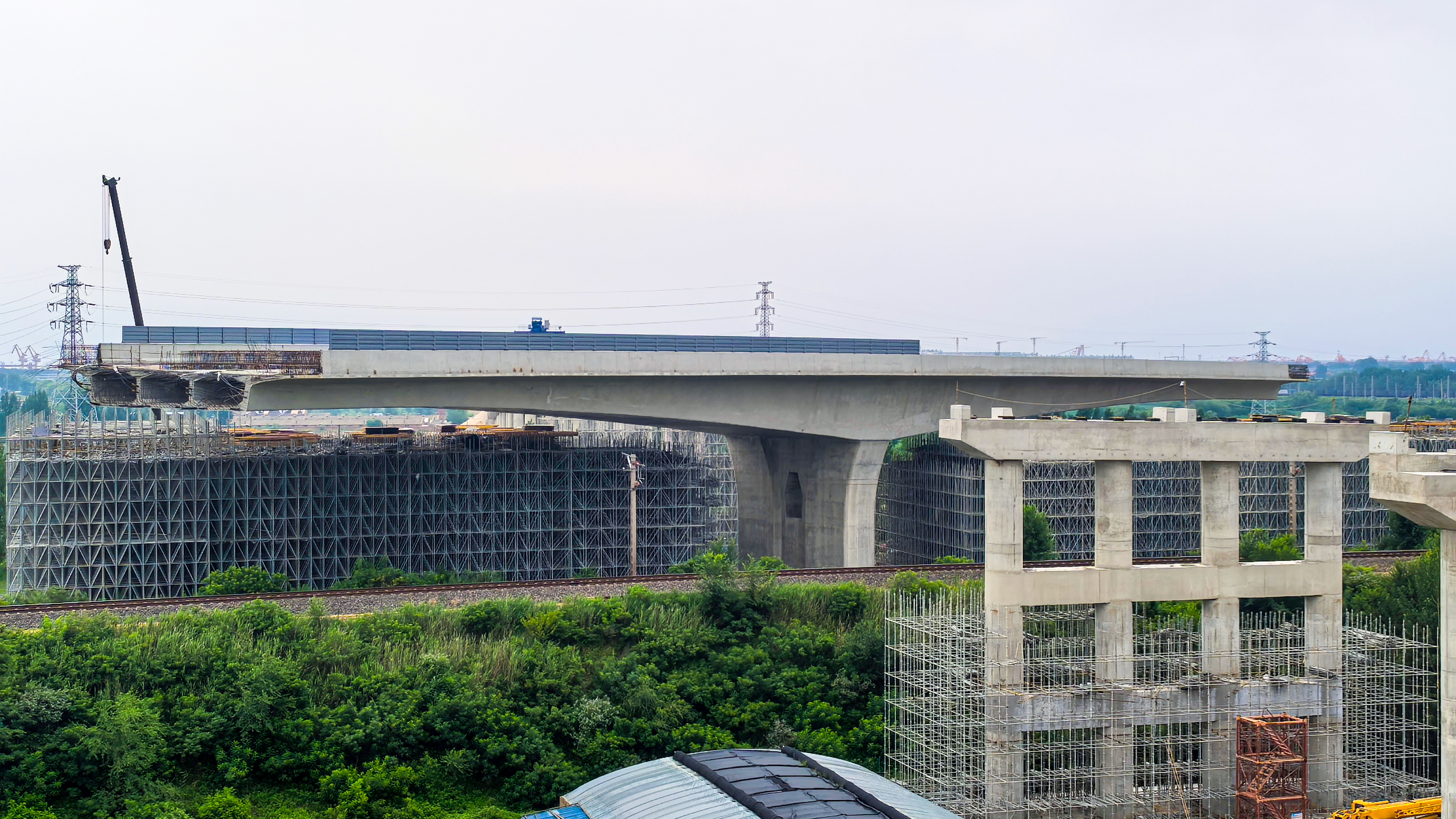 為保證大橋順利轉體及三條鐵路的運營安全,建設團隊上演‘鐵道游擊戰’,在列車間隙搶出施工窗口,運用BIM+3D激光掃描技術構建全尺寸數字孿生模型,將梁體、支座、牽引系統等每一個細節都精準還原到數字空間,為轉體施工的每一步操作提供了強有力的支撐;轉體過程中,北斗定位系統化身“空中標尺”,通過激光追蹤,實時捕捉梁體三維坐標,精度達到±0.5毫米,讓萬噸巨梁在轉體過程中的每一絲微小位移都能被精準捕捉;自動連續頂推系統則化身“指揮者”,可根據轉體過程中的實時數據,智能調節轉體速度,確保萬噸級梁體在轉體過程中始終“穩如泰山”,最終實現“毫米級”精準對接。