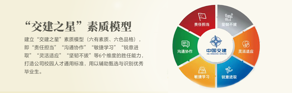 建立“交建之星”素質(zhì)模型(六有素質(zhì)、六色品格),即“責(zé)任擔(dān)當(dāng)”“溝通協(xié)作”“敏捷學(xué)習(xí)”“銳意進(jìn)取”“靈活適應(yīng)”“堅(jiān)韌不拔”等6個(gè)維度的勝任能力,打造公司校園人才通用標(biāo)準(zhǔn),用以輔助甄選與識(shí)別優(yōu)秀畢業(yè)生。