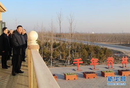 2019年1月16日下午,習(xí)近平總書記來到“千年秀林”大清河片林一區(qū)造林區(qū)域,乘車穿行林區(qū)察看林木長勢,并在秀林驛站結(jié)合展板聽取雄安新區(qū)生態(tài)建設(shè)總體情況和“千年秀林”區(qū)域植樹造林情況介紹,登上二層平臺(tái)遠(yuǎn)眺林區(qū)全貌,對運(yùn)用科學(xué)方法植樹造林、運(yùn)用信息化手段管林護(hù)林的做法表示贊賞。他強(qiáng)調(diào),先植綠、后建城,是雄安新區(qū)建設(shè)的一個(gè)新理念。良好生態(tài)環(huán)境是雄安新區(qū)的重要價(jià)值體現(xiàn)。“千年大計(jì)”就要從“千年秀林”開始,努力接續(xù)展開藍(lán)綠交織、人與自然和諧相處的優(yōu)美畫卷。