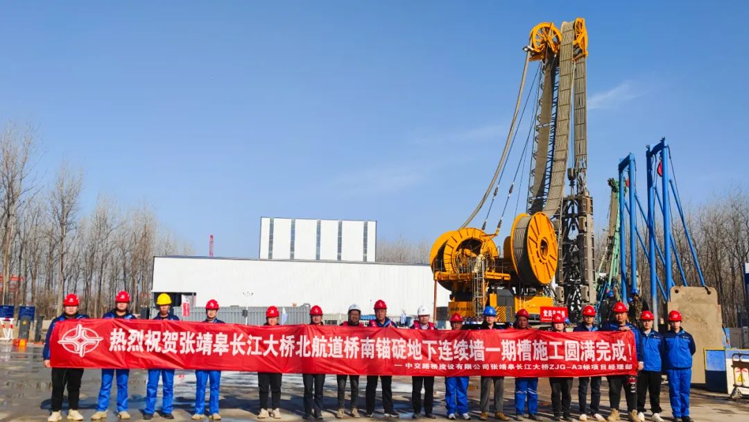 中交路建承建的江蘇張靖皋長江大橋北航道橋南錨碇采用深層地基加固的復合地基圓形地連墻基礎,大面積深層地基加固水平封底方案為橋梁工程首創。春節期間,項目150余名管理人員和作業工人堅守崗位就地過年,全力以赴推進工程建設,共完成6個一期槽段和2個二期槽段的施工,累計澆筑混凝土4170立方米,占地連墻總工程量的17.5%,將原計劃時間節點提前了20天,為后續深層地基加固和基坑開挖奠定了良好的基礎。