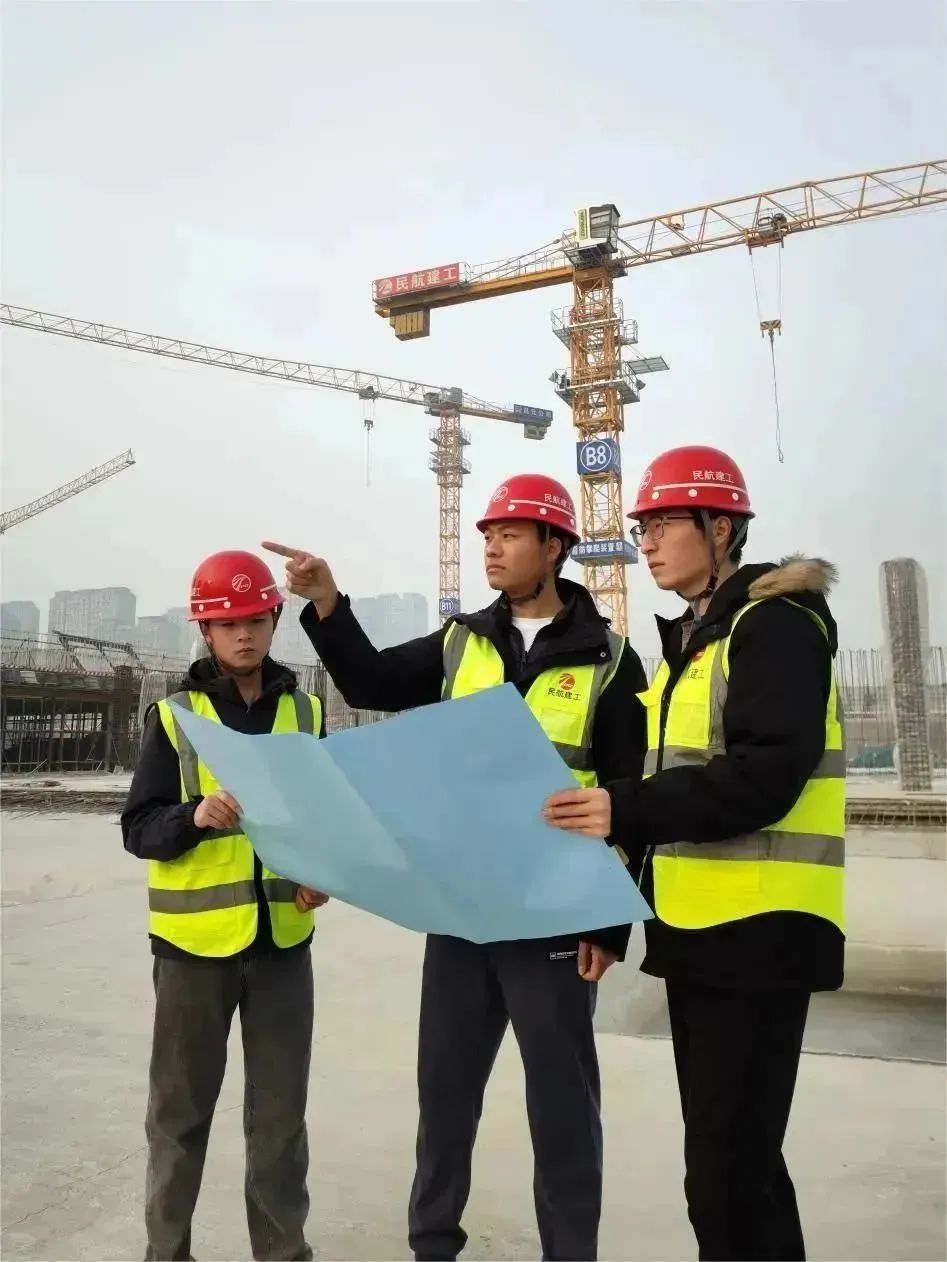 民航機場建設集團所屬民航建工山東聊城市東昌府區五七里鋪片區棚戶區改造項目員工在施工一線,對照圖紙檢查現場施工情況,爭分奪秒搶工期、保進度。