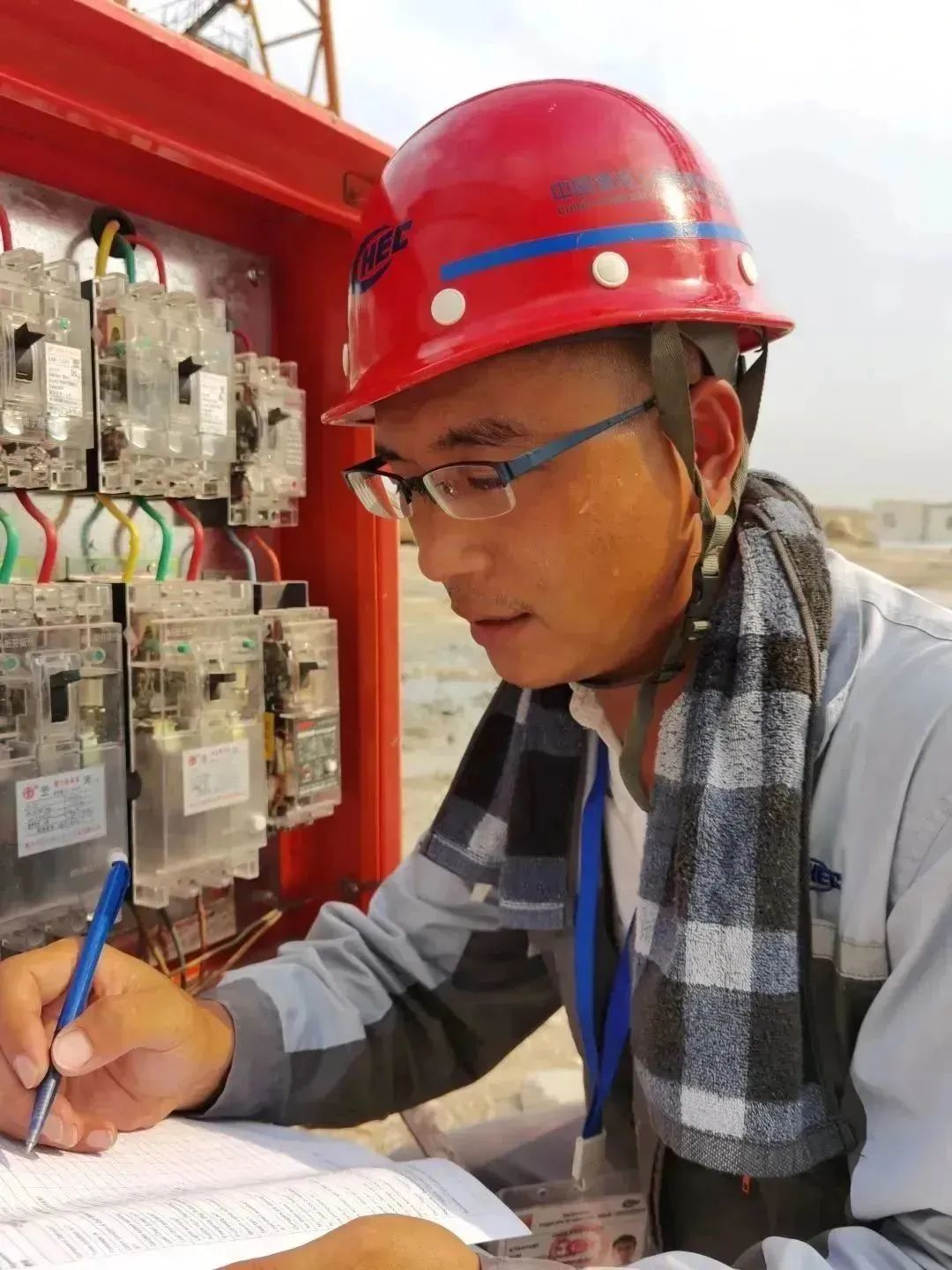 中國港灣阿爾及利亞斯基克達項目部電工正在檢修配電箱。
