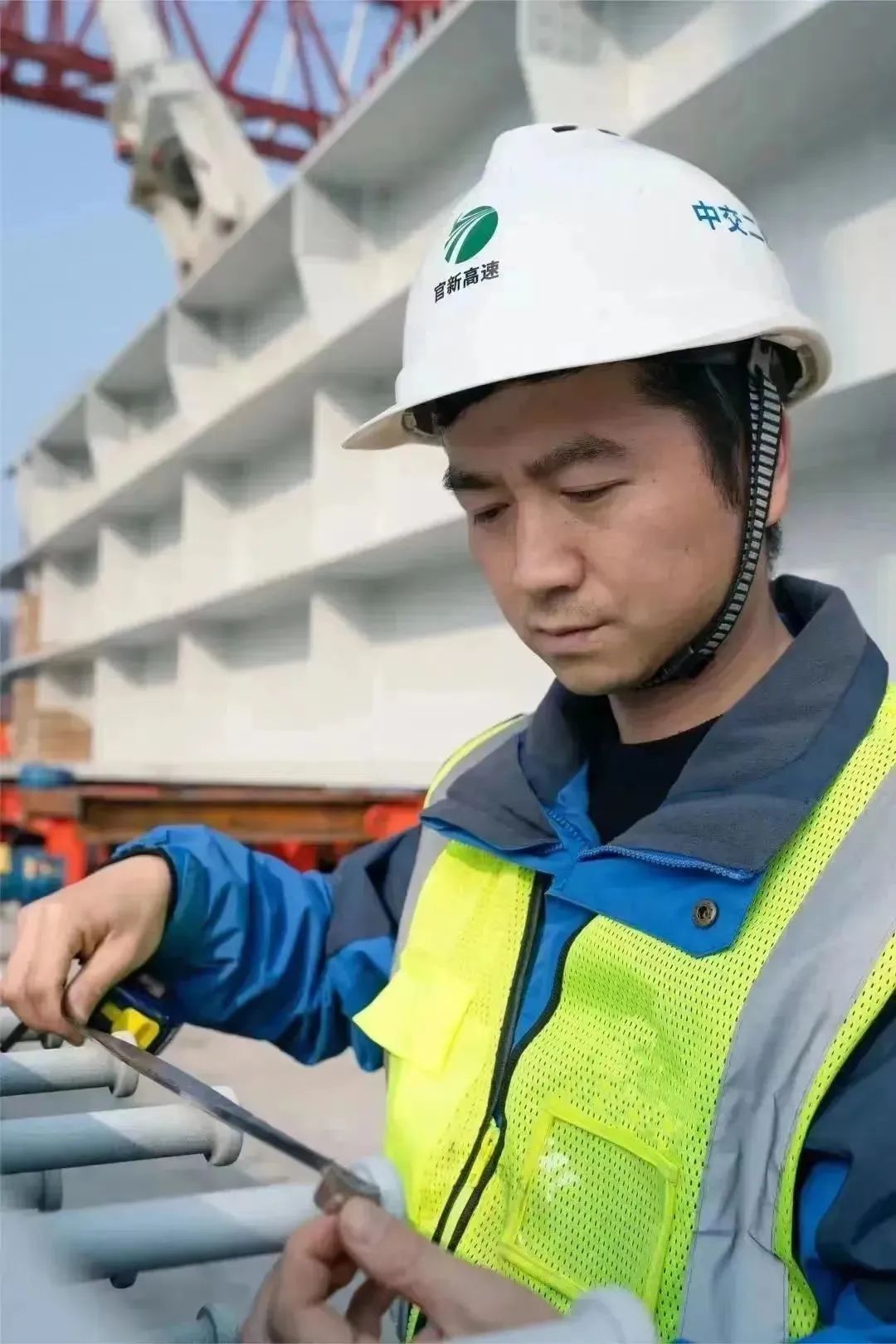 二航局湖南官新高速公路馬路口資水特大橋工程師正在現場檢查主梁情況。