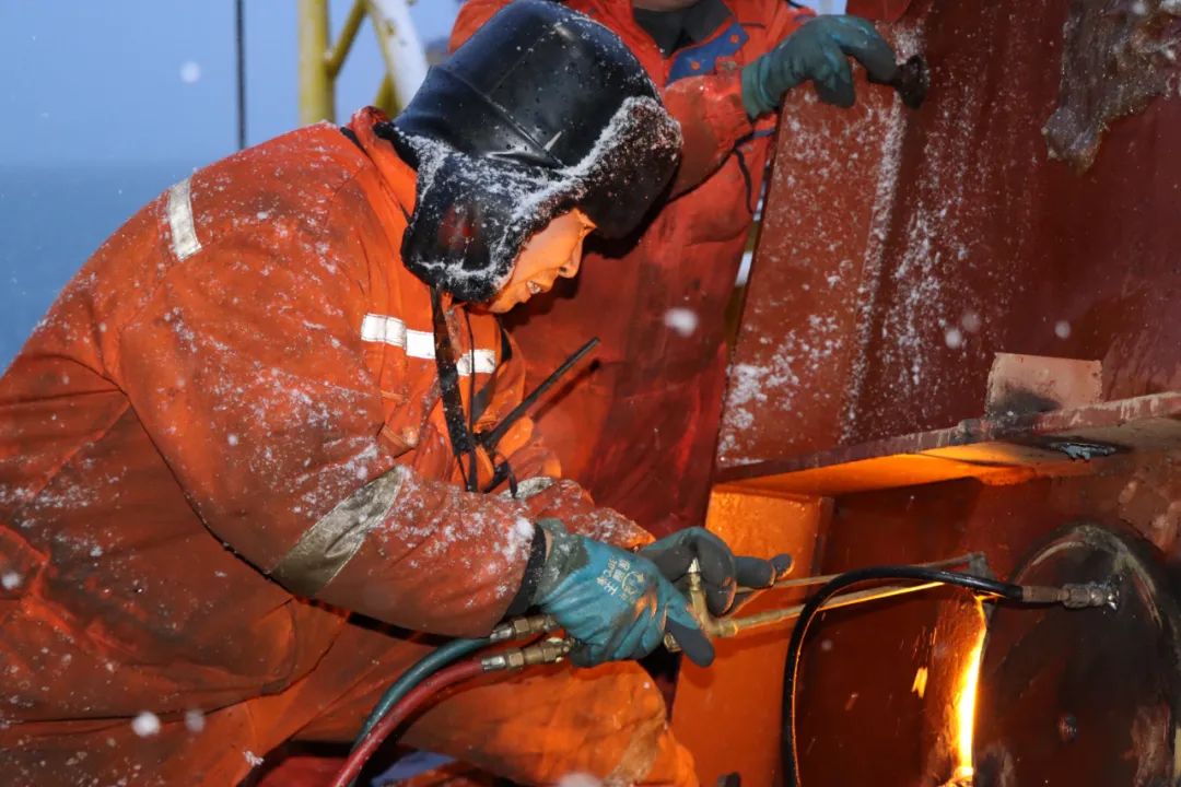 天航局“天鯨號”電焊工正在維修船舶絞刀橫移滑輪,確保船舶高效安全生產。