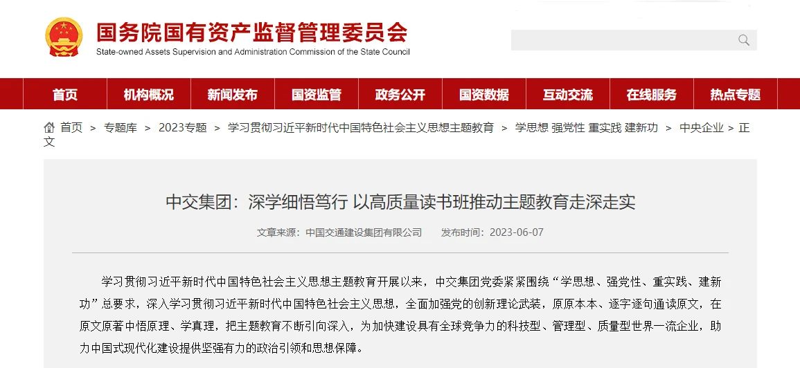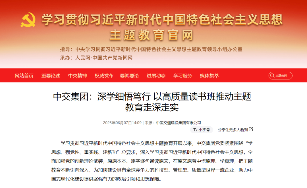 近日,學(xué)習(xí)貫徹習(xí)近平新時(shí)代中國特色社會(huì)主義思想主題教育官網(wǎng)和國務(wù)院國資委官網(wǎng),刊發(fā)了題為《中交集團(tuán):深學(xué)細(xì)悟篤行 以高質(zhì)量讀書班推動(dòng)主題教育走深走實(shí)》的文章,報(bào)道中交集團(tuán)深入開展學(xué)習(xí)貫徹習(xí)近平新時(shí)代中國特色社會(huì)主義思想主題教育情況。