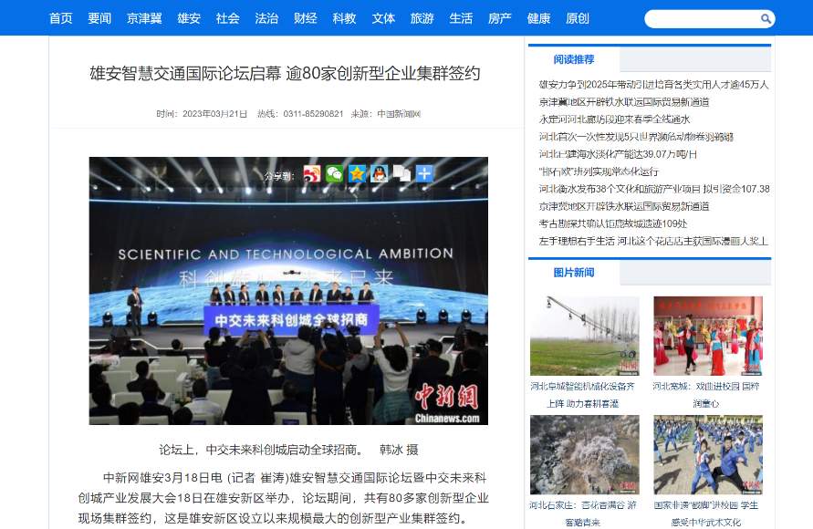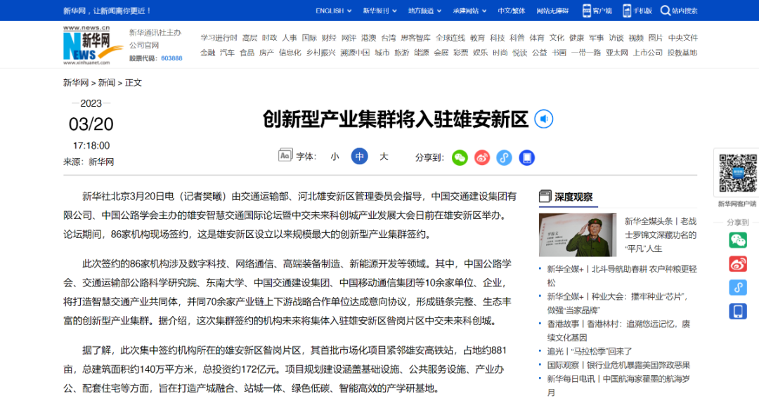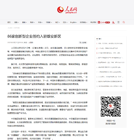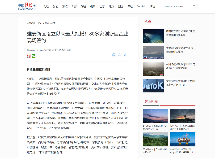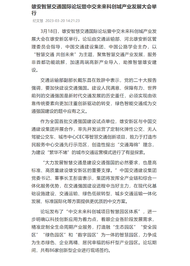 河北日報刊發報道,雄安智慧交通國際論壇暨中交未來科創城產業發展大會在雄安新區舉辦,86家創新型企業現場簽約,這是雄安新區設立以來規模最大的創新型產業集群簽約。