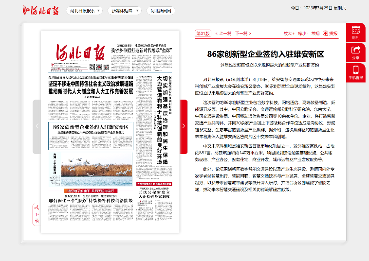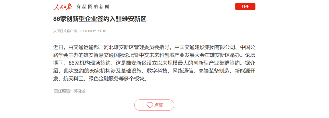 北京日報客戶端刊發報道, 86家創新型企業現場簽約,這是雄安新區設立以來規模最大的創新型產業集群簽約,旨在打造產城融合、站城一體、綠色低碳、智能高效的世界一流產學研基地、創新創業的首選之地、“未來城市”的新標桿。