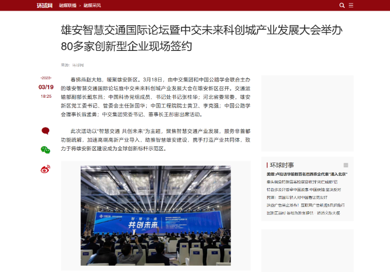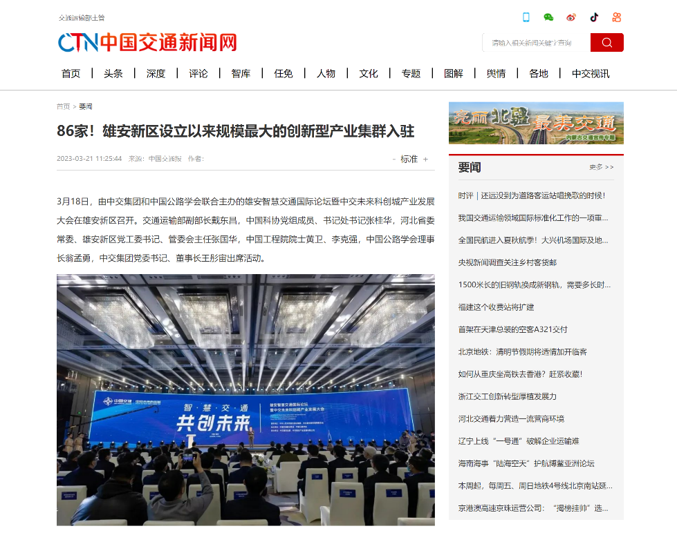 央視綜合頻道《新聞聯播》報道,雄安智慧交通國際論壇暨中交未來科創城產業發展大會在雄安新區舉辦,80多家創新型企業現場簽約。這些企業包含數字科技、網絡通信、新能源開發等,未來將集體入駐雄安新區中交未來科創城。