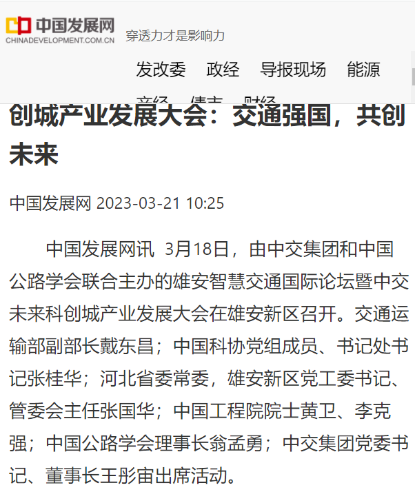 人民網刊發報道提及中交集團黨委書記、董事長王彤宙的致辭,中交集團將持續與雄安新區深化戰略合作,發揮領先優勢,勇當主力建設“交通強國”;突出科技創新,緊盯關鍵打造“創新高地”;提升服務質量,同心協力共創“雄安樣板”;強化引領帶動,內外協同推動“產業升級”。