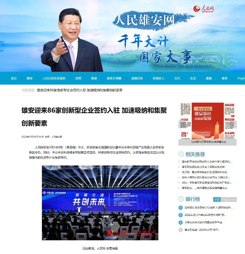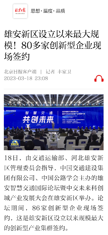 北京商報刊發報道,雄安新區,千年大計,這座新時代“未來之城”正從規劃藍圖變為現實樣板。這不僅是雄安新區設立以來規模最大的創新型產業集群簽約,也是雄安新區首次以市場化方式引導打造的智慧交通產業生態。