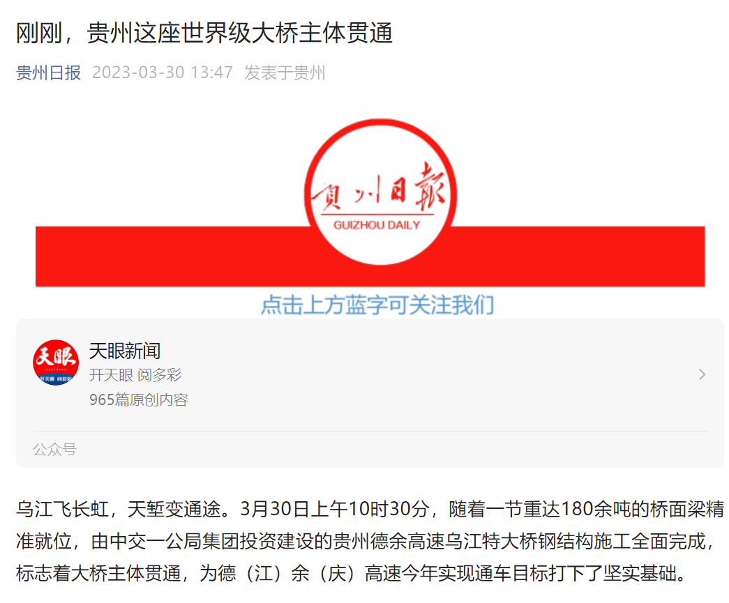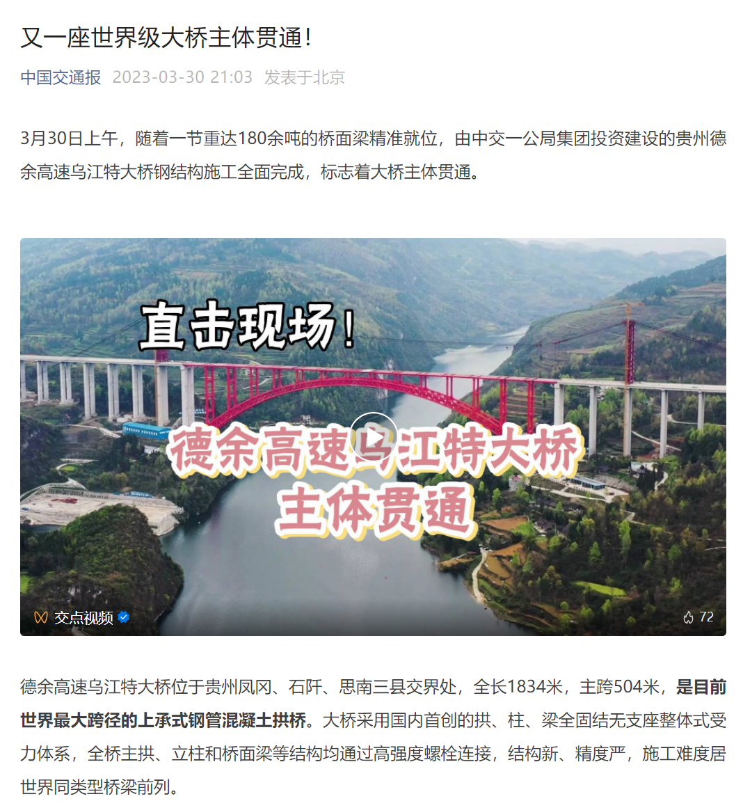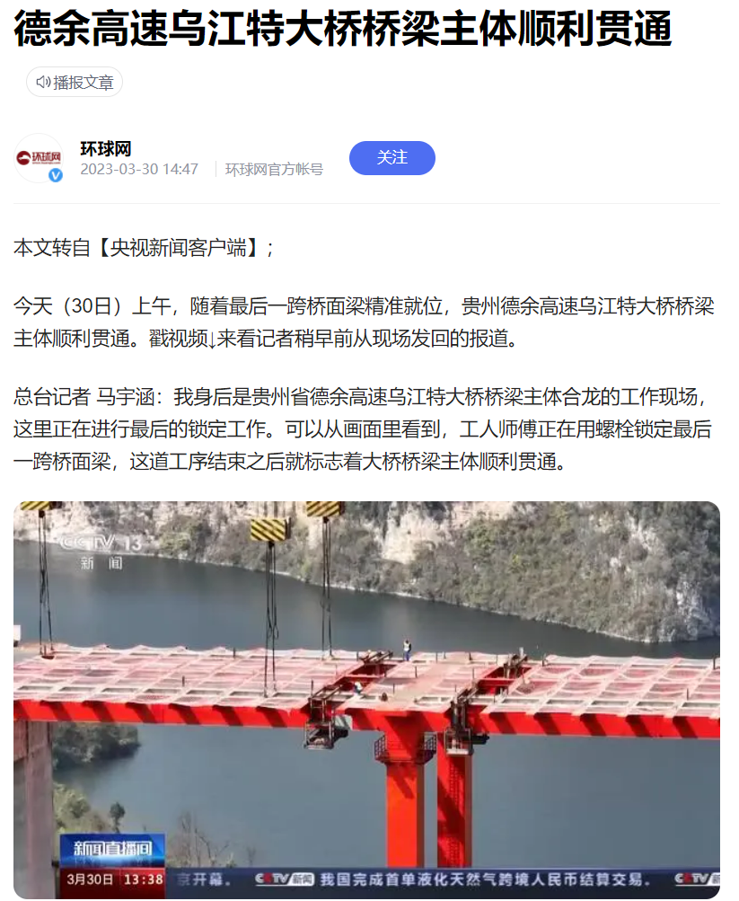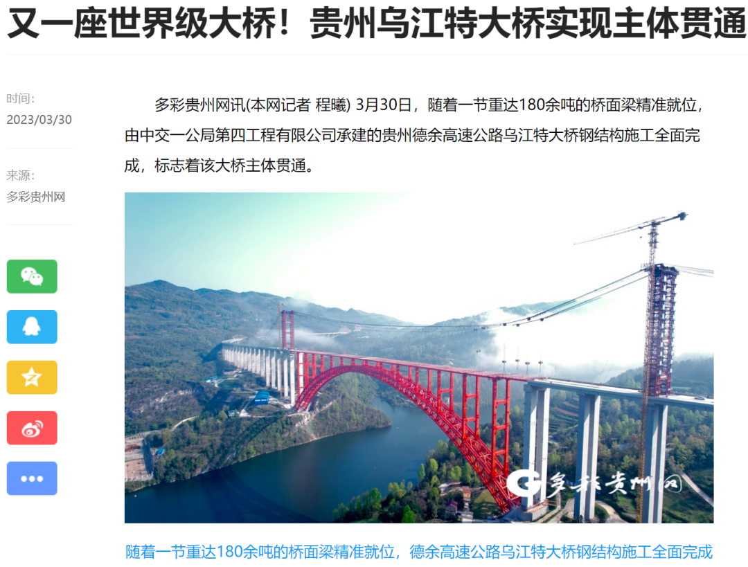 超級橋梁再“上新”丨主流媒體關注德余高速烏江特大橋主體貫通